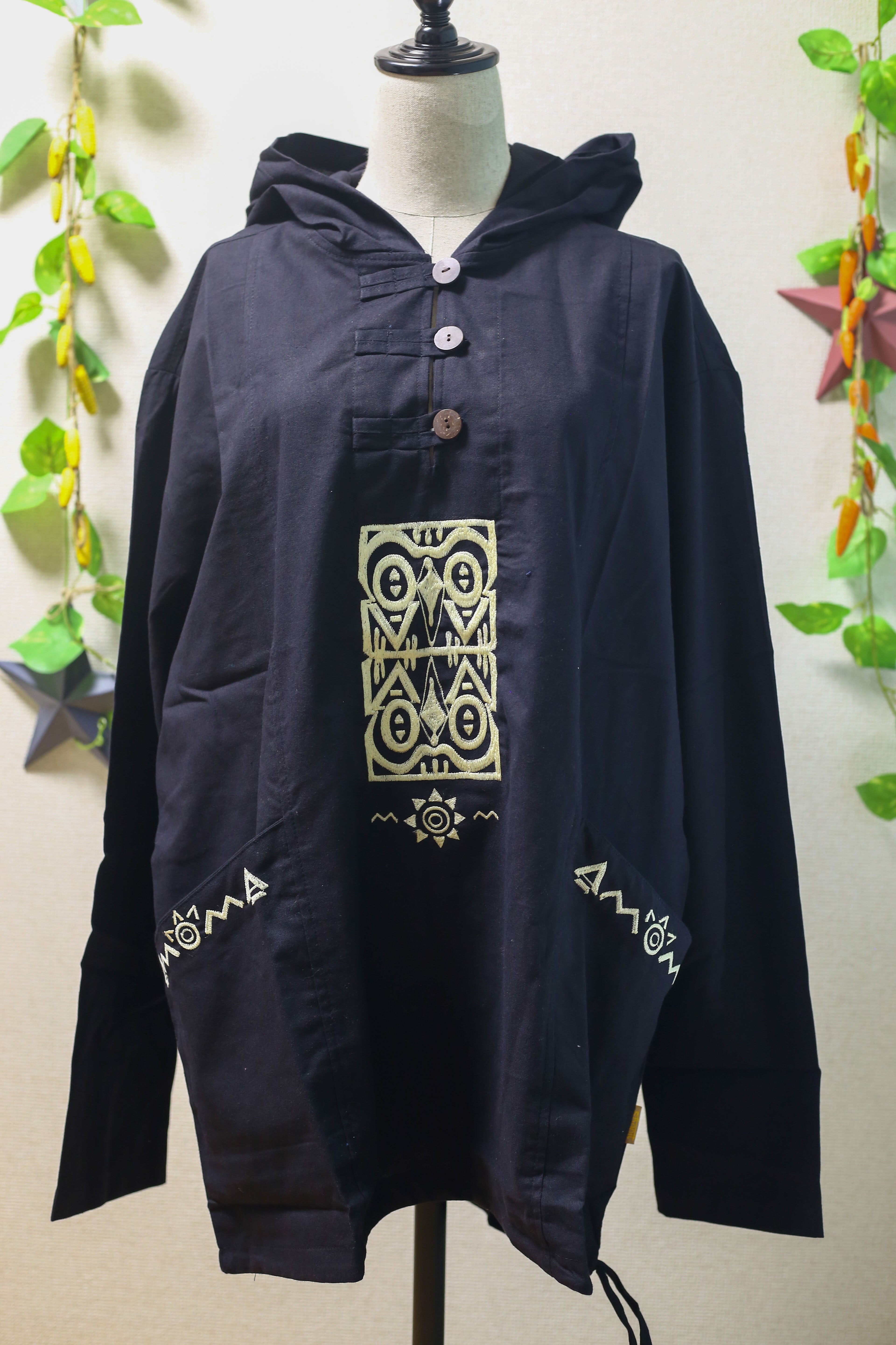 トーテムポールの様な刺繍が施されたオリジナルパーカー。