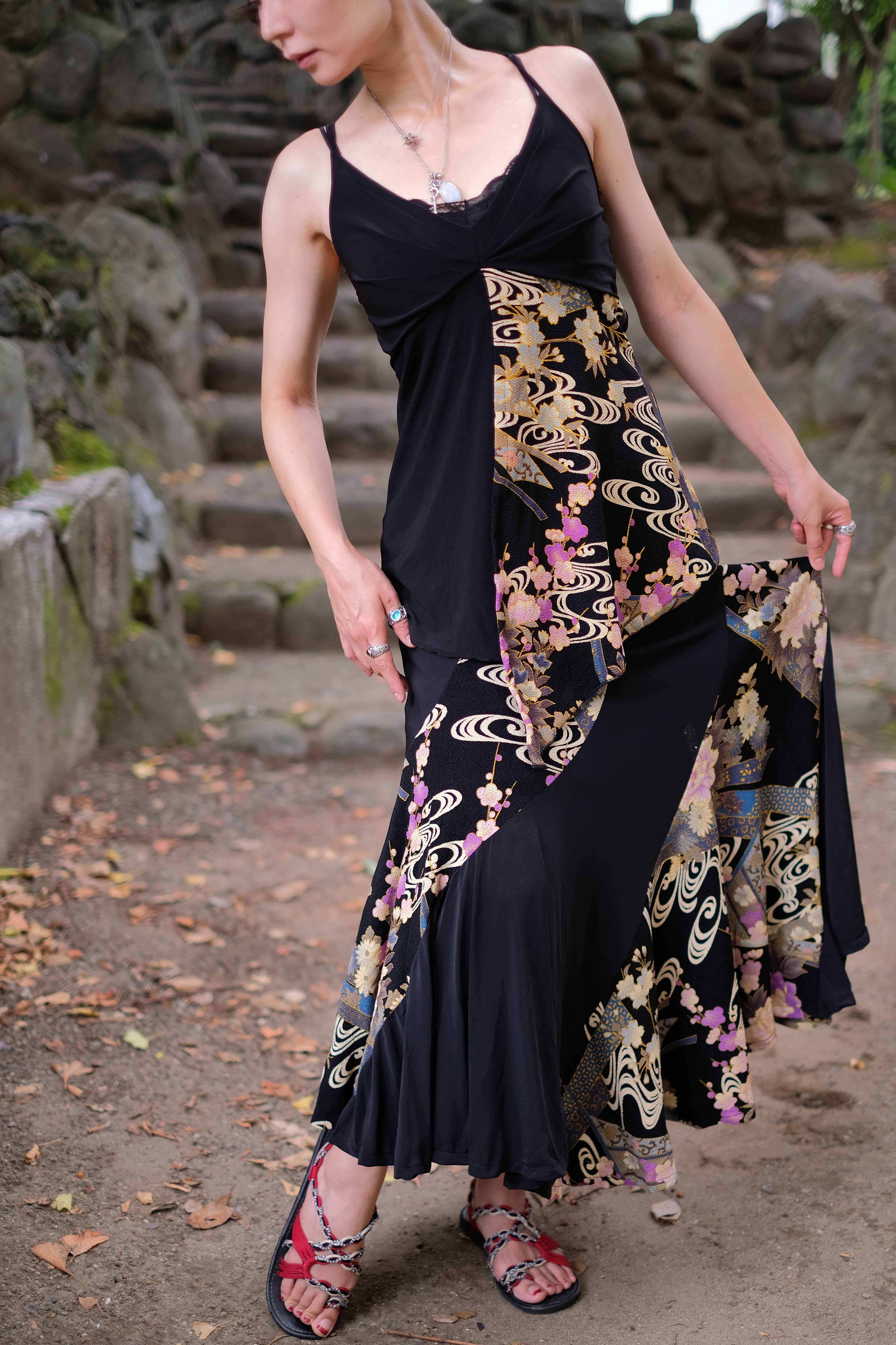 和柄がひらりと主張するキャミソール。